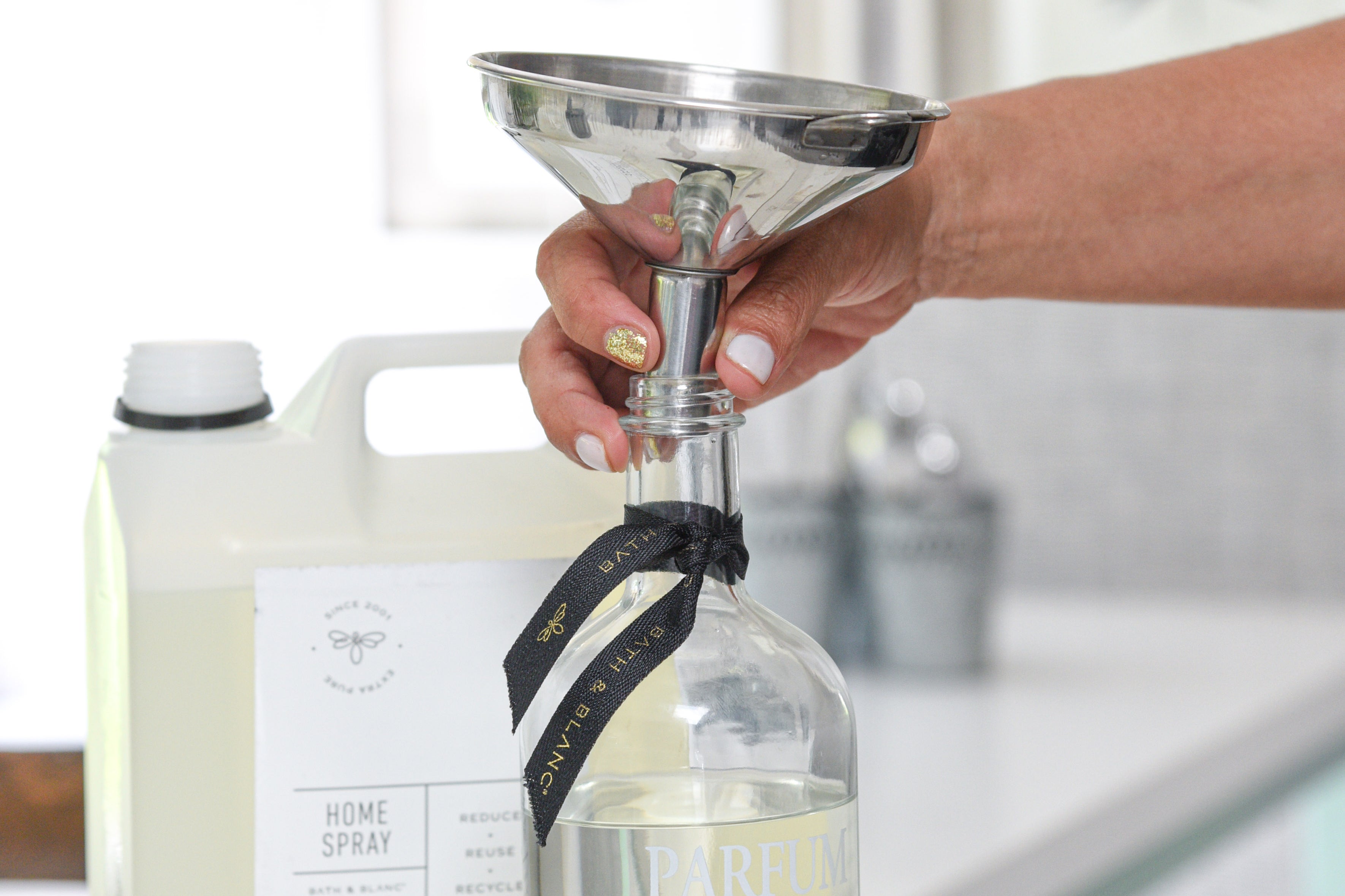 Embudo de metal para rellenar tus productos Bath & Blanc.